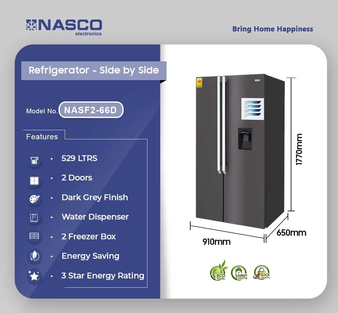 Keep your food fresh and organized with the Nasco 529Ltrs Side By Side Refrigerator.