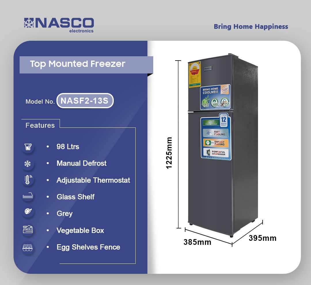 Keep your food fresh and frozen with the Nasco 98Ltrs Top Mounted Freezer.